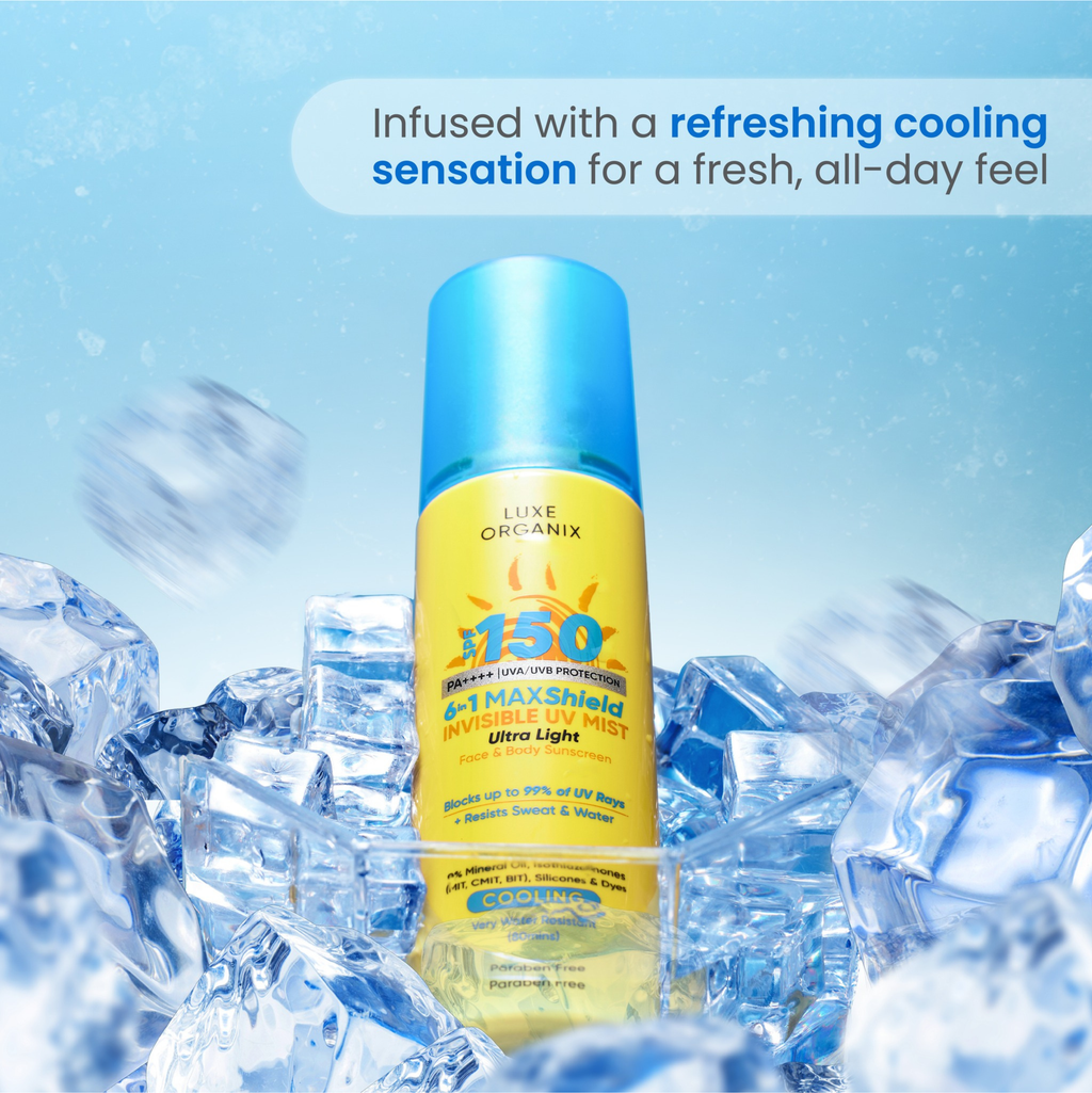 Luxe Organix 6-in-1 MAXShield Active Ultra Sheer Face & Body Invisible UV Mist is your ultimate sun protection solution with Broad Spectrum SPF 150+ PA++++. Designed for an ultra-lightweight, non-sticky feel, it dries quickly and adheres tightly to the skin, leaving it fresh, smooth, and moisturized. Specifically formulated to withstand sweat and water for up to 80 minutes, providing long-lasting protection that blocks up to 99% of UV rays.