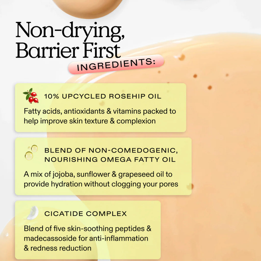 Formulated with with Linoleic Acid-Rich Oils targets congestion, supports healthy sebum levels, and promotes clearer skin — without compromising your skin barrier with harsh or drying ingredients. Cicatide Complex, a blend of 5 skin-soothing Peptides and Madecassoside for anti-inflammation and redness reduction. Transforming acne-causing sebum without drying out your skin thanks to Rosehip Oil. It's packed with fatty acids, antioxidants, and vitamins A, C, & E to promote skin turnover for an even complexion. Nourishing Omega Fatty Acids, a mix of Jojoba, Sunflower, and Grapeseed Oil come together to provide hydration without clogging your pores. Purple Gromwell Root Extract, a powerful antioxidant with barrier repair properties.