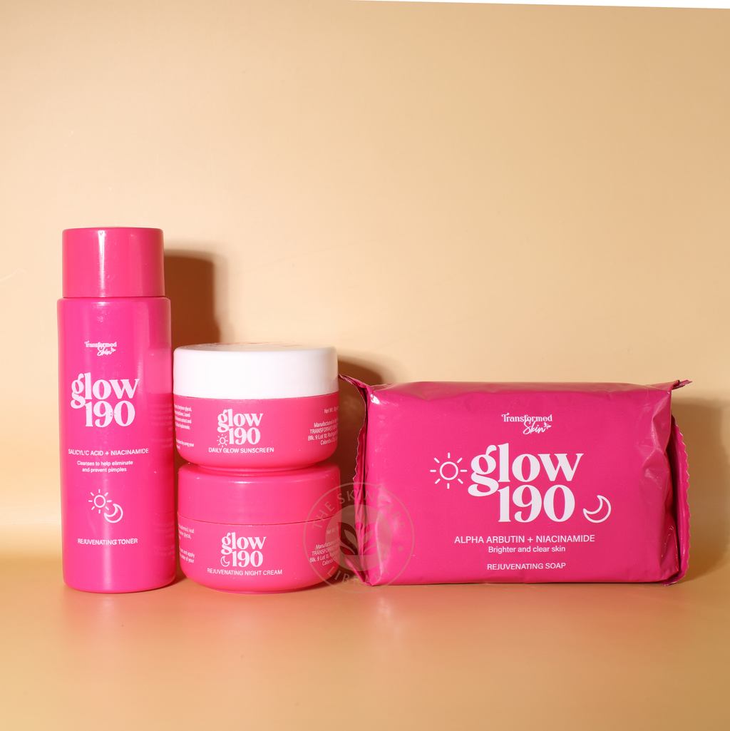 Glow 190 Rejuvenating Set is designed to help treat acne, lighten, smoothen, and repair the skin. Enriched with a combination of powerful actives and skin loving ingredients to give your skin glowing, smooth and visibly refined tone and texture.