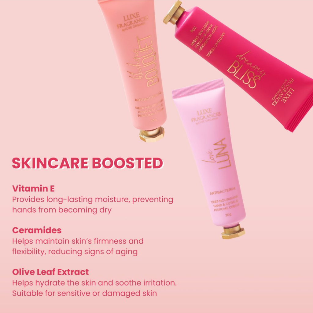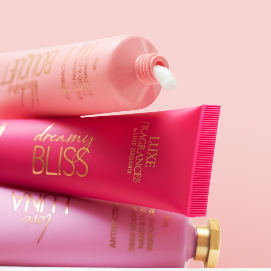 The Deep Nourishing Hand & Cuticle Perfume Cream comes in 3 scents: Dreamy Bliss, Love Luna, and Blushing Bouquet.