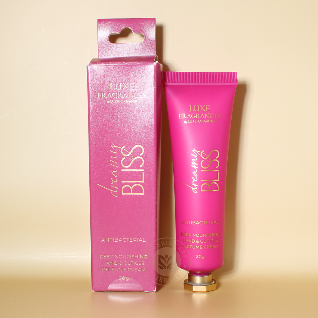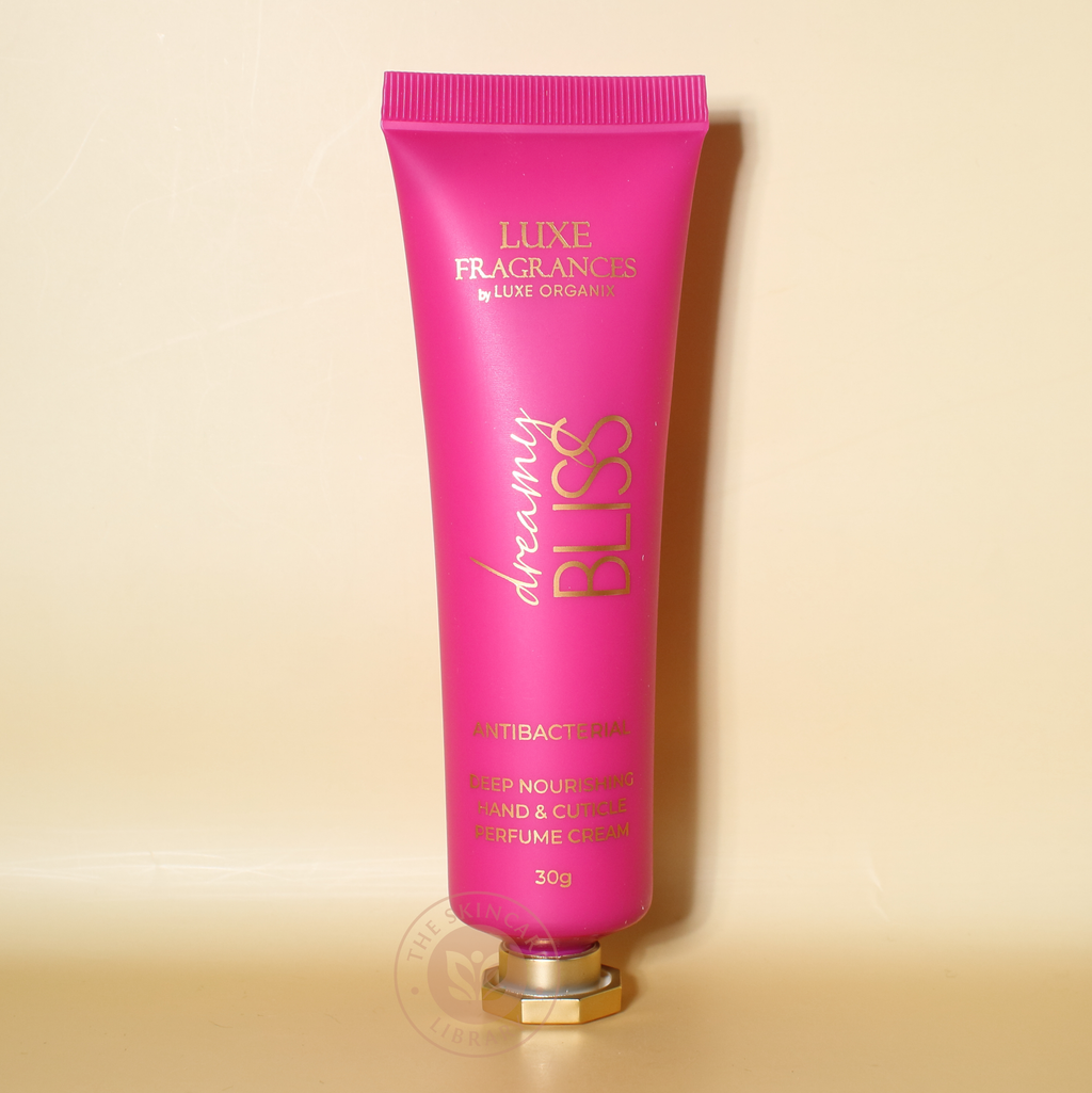 Luxe Fragrances by Luxe Organix Deep Nourishing Hand & Cuticle Perfume Cream is a non-sticky, non-greasy, and antibacterial perfume hand cream formulated with Vitamin E, Ceramides, and Olive Leaf Extract, it helps nourish and visibly improve skin texture, while providing intense hydration. It is lightweight and fast-absorbing perfume cream that leaves hands feeling soft to touch. Choose your favorite Luxe Fragrance for a delightful sensory experience with every application.