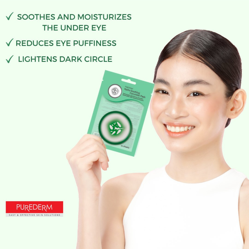 Purederm Hydro Soothing Cucumber Pads are pre-moistened with real Cucumber and other soothing ingredients. When used on top of your eyes, these Cucumber pads soothe tired, stressed eyes and help reduce puffiness and dark circles.