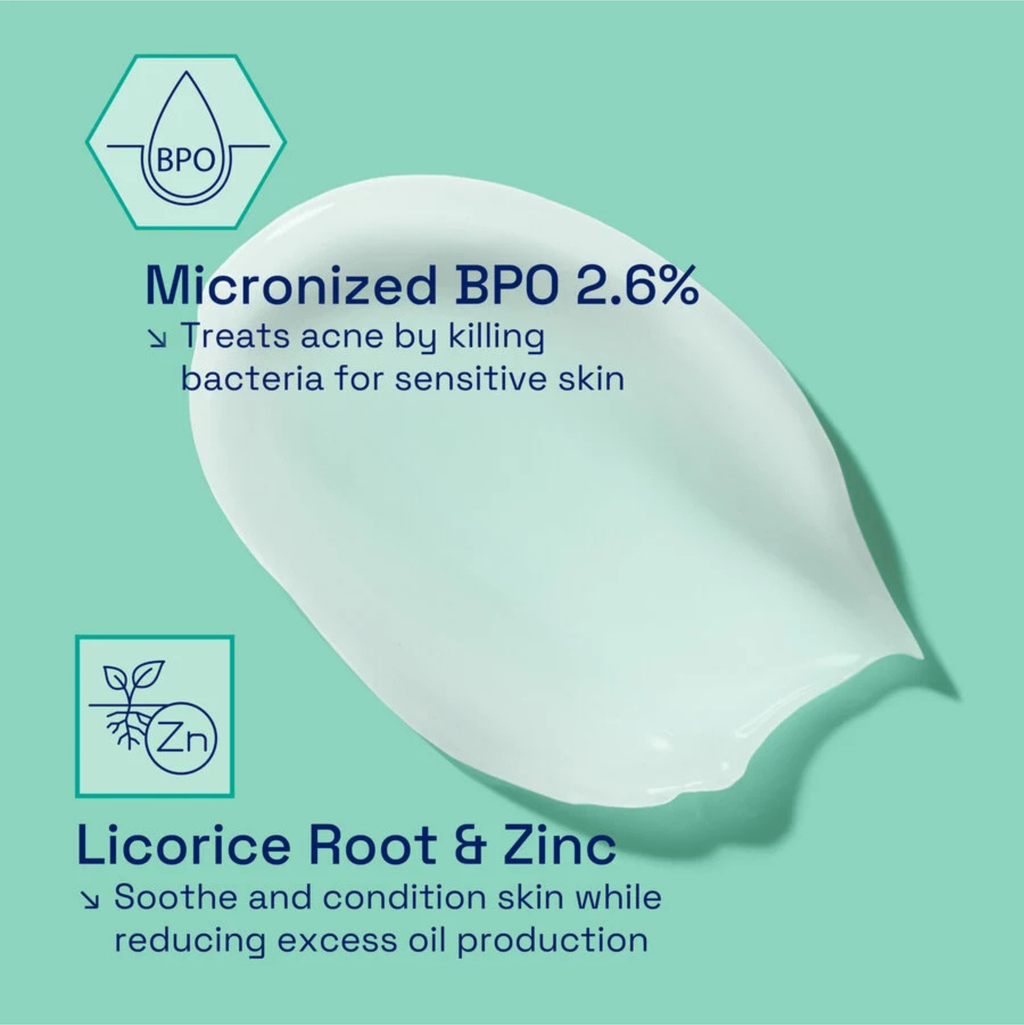 This creamy, soothing formula with 2.6% Micronized Benzoyl Peroxide starts working immediately to clear breakouts by targeting acne causing bacteria while helping maintain the skins moisture barrier.