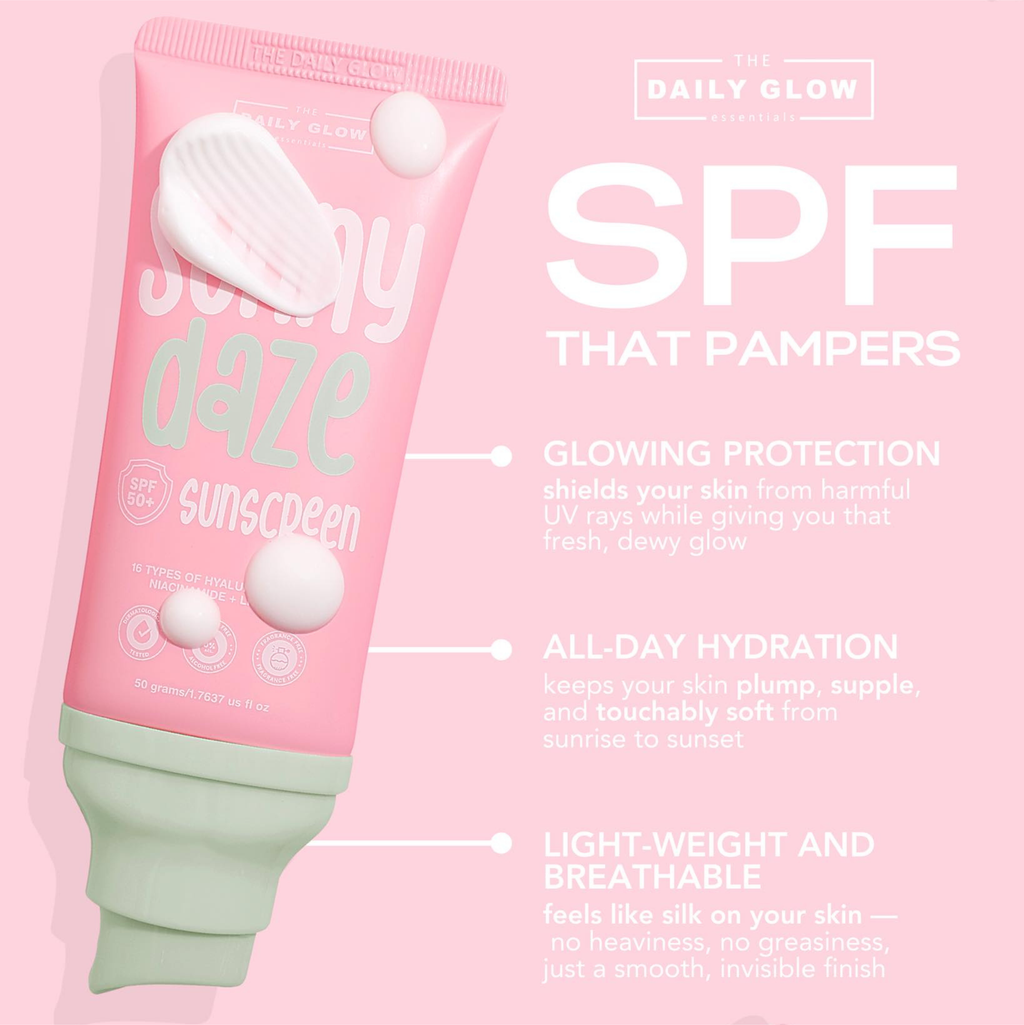 The Daily Glow Sunny Daze Sunscreen SPF50 delivers broad-spectrum protection with a lightweight, non-greasy formula designed for daily wear. This expert-formulated sunscreen shields skin from UVA and UVB damage while maintaining a natural finish that works seamlessly under makeup or alone. Ideal for all skin types, it provides reliable sun protection without the heavy feel of traditional sunscreens, making it an essential step in any comprehensive skincare routine.