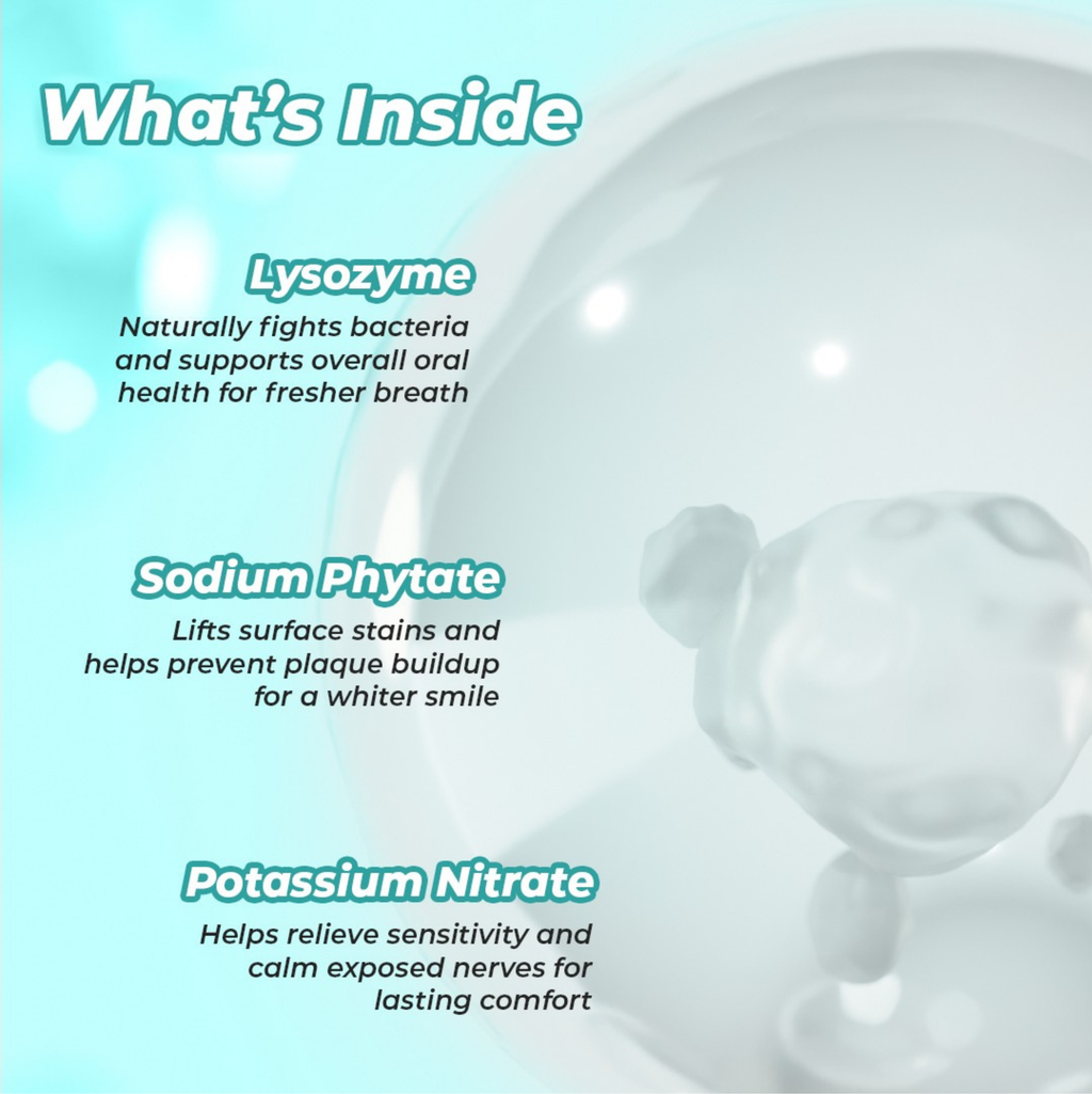 Hydrated Silica, PEG-8, Aroma, Sodium Lauroyl Sarcosinate, Cellulose Gum, Cocamidopropyl Betaine, Sodium Benzoate, Chondrus Crispus, Menthol, Sodium Fluoride, Sucralose, Sodium Phytate, Potassium Nitrate, Sodium Chloride, CI 77019, Arginine, Cl 77891, Phenoxyethanol, Lysozyme, Dextranase, Centella Asiatica Extract, Ethylhexylglycerin.