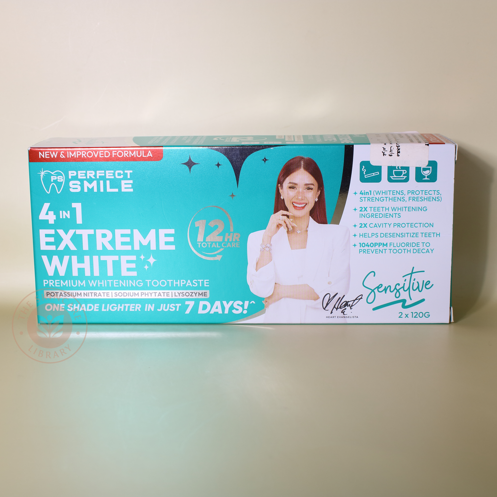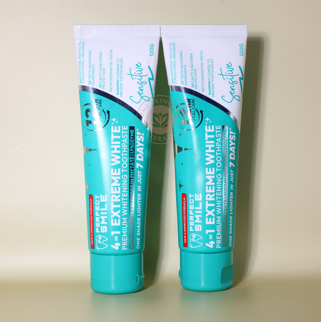 Reveal a brighter, healthier smile with Perfect Smile 4 in 1 Extreme White Premium Whitening Toothpaste for Sensitive Teeth! Infused with Potassium Nitrate, Sodium Phytate, Hydroxyapatite, and Lysozyme, this new and improved formula relieves sensitivi-ty, promotes healthy enamel, and supports oral breath health. Its low-abrasion formula provides 12-hour total care, helping prevent plaque buildup while gently lifting stains from food, drinks, and smoking.